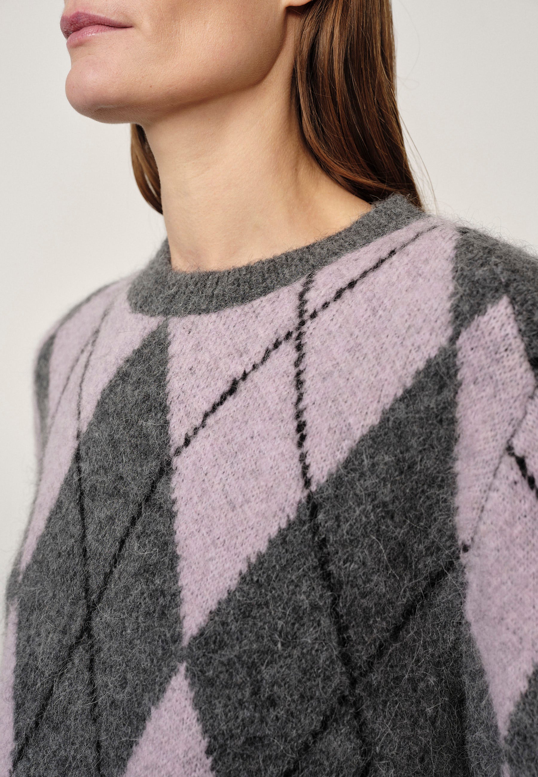 Einstök peysa frá Herskind með síðum ermum. Rosalega mjúk blanda sem inniheldur Alpaca & ull, sem hnökrar ekki. Peysan er laus í sniði og með fallegu check mynstri í gráum og bleikum tónum.