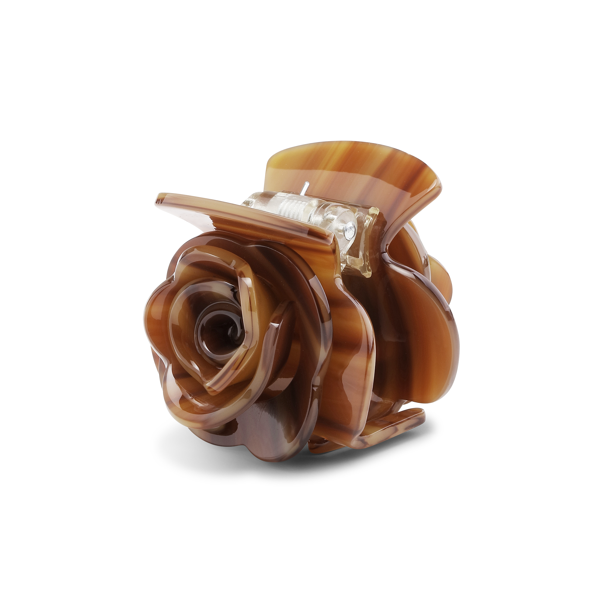 Falleg mynstruð hárspenna með góðu gripi, mótuð í rósa form. Kaffi brúnir tónar. Minni stærð.